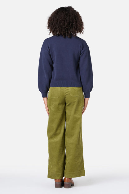 Navy blue, cosy cotton blend knit cardigan. A relaxed v neck style, hand embroidered with sweet yellow & orange flowers